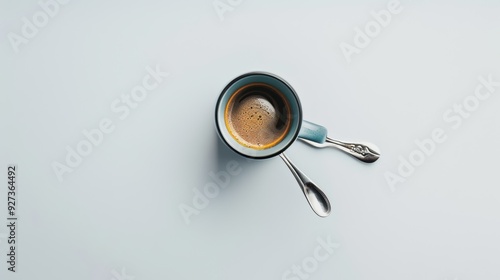 Minimalist elegance: a blue coffee cup on a white background with two spoons positioned nearby