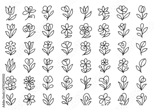 Minimalist Floral Doodles Line Art Vector Set. Hand Drawn Botanical Flower and Leaf Elements for Logo and Design.
