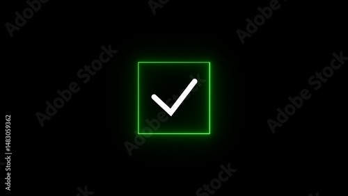 Minimalist green checkmark inside square neon light icon against a dark background representing approval success or validation
