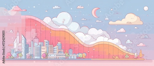 Minimalist Growth Chart Illustrating Startup Valuation Dynamics with a Steep Drop in a Colorful Cityscape Background
