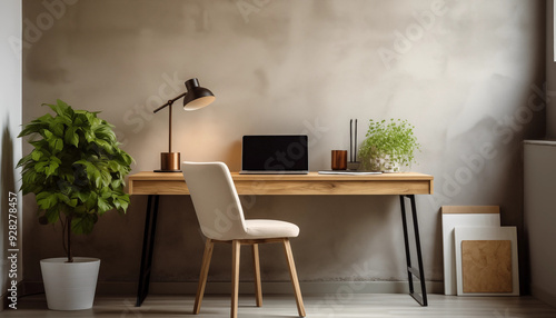 Minimalist Home Office Desk with Laptop Lamp and Plants
