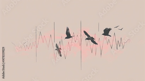 minimalist illustration of a heartbeat line transforming into birds flying upward muted pink and gray on birds .