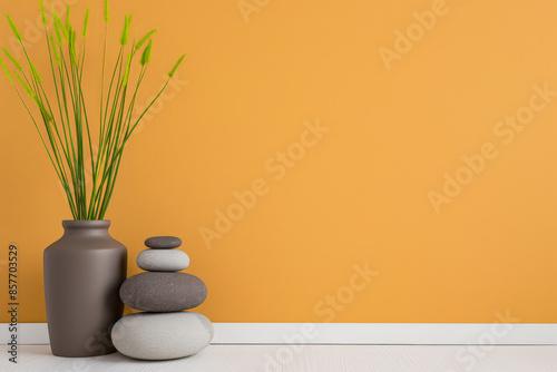 Minimalist interior design composition with zen serene elements in an apartment room filled with natural window lighting. Residential Real Estate concept image.