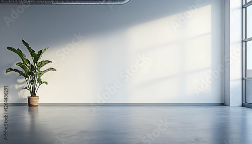 Minimalist interior design; empty room with large window, concrete floor, and a bird of paradise plant. Perfect for showcasing products or creating a serene atmosphere.