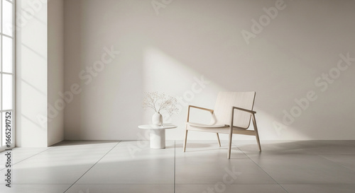 Minimalist interior living space with white chairs, a small table, and strong natural light casting dramatic shadows on the wall.