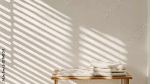 Minimalist interior with layered shadows on wall and wooden bench with towels