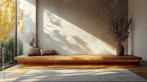 Minimalist Japanese-style room with a wooden platform, rug, and two vases.
