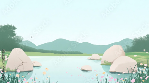 Minimalist Lake Scene with Submerged Rocks and Rolling Hills Under Soft Spring Sky