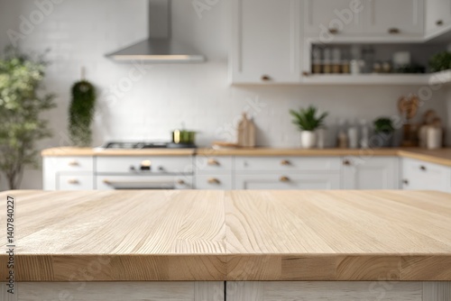 Minimalist Light Beige Wooden Table Top with Blurred Kitchen Background – Perfect Mockup Surface for Product Display or Design Presentation