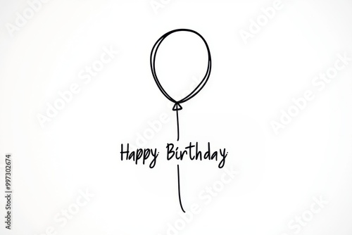 Minimalist line art illustration of a single balloon and the text "Happy Birthday", white background, black lines, simple shapes Generative AI