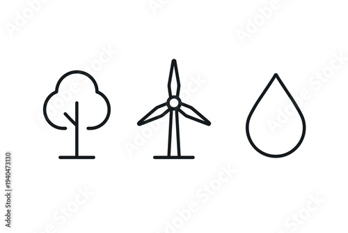 Minimalist linear icons of tree, wind turbine, and water drop