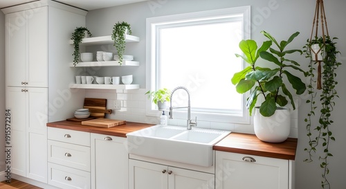 Minimalist modern kitchen interior close up farmhouse sink under bright window with wooden countertop fiddle leaf fig plant and open shelves natural light cozy clean scandinavian