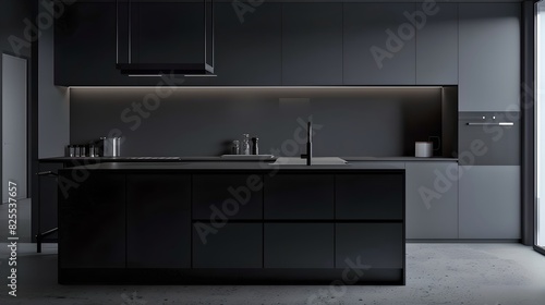 Minimalist modern kitchen with sleek black cabinetry and ambient lighting. Stylish and functional cooking space. Perfect for contemporary homes. AI