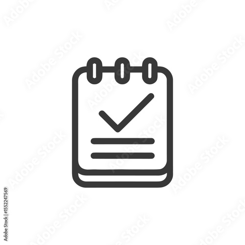 Minimalist Notebook Icon with Checkmark, Dark Gray Outline on White Background