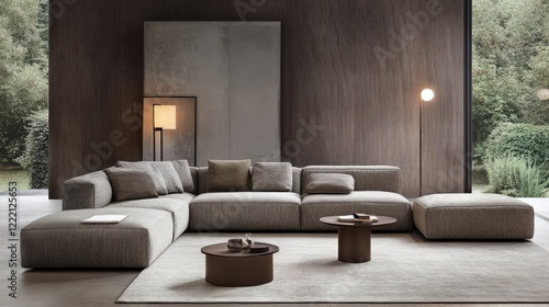 Minimalist open-plan living area with neutral colors, a soft gray couch, and a modern floor lamp.
