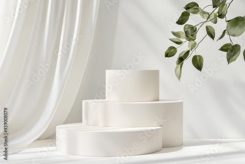Minimalist Podium Display with Flowing Curtains and Green Foliage