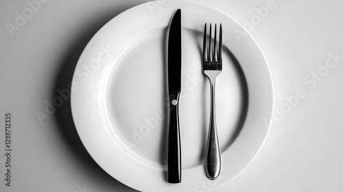 Minimalist Presentation of Knife and Fork on Plain White Plate Against Subtle Grey Background