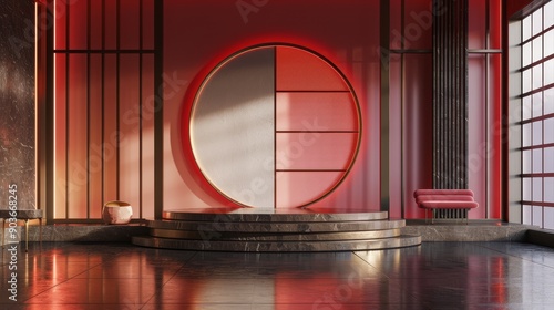 Minimalist red and gold podium with a large circle and a red chair in a modern, Asian-inspired interior.