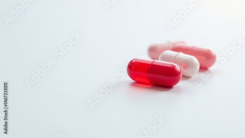 Minimalist red capsule banner, ultra-clean white setting, healthcare promotion focus, detailed pharmaceutical shot
