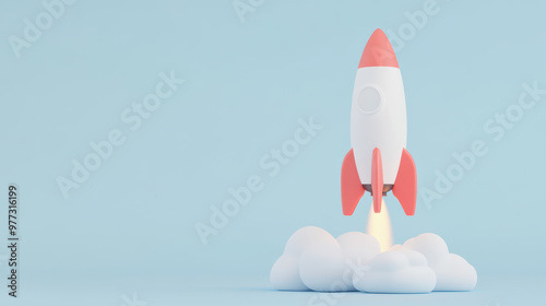 Minimalist rocket launching from cloud against pastel blue background, symbolizing innovation and startup concepts.