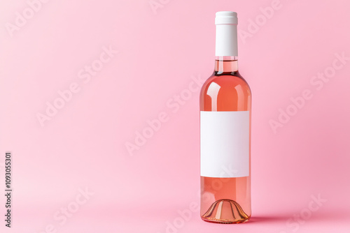Minimalist rosé wine bottle featuring a blank white label, set against a soft pink background, perfect for branding and product mockups.