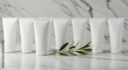 Minimalist skincare product mockup featuring white cosmetic tubes and a green olive sprig on an elegant white marble backdrop.