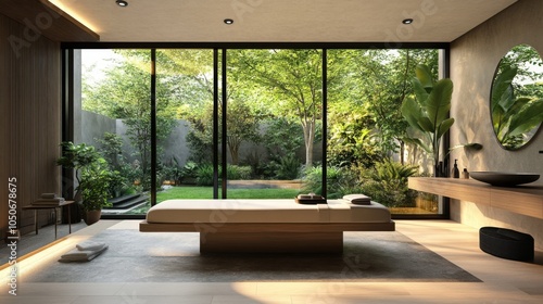Minimalist Spa Interior with Lush Green Garden View