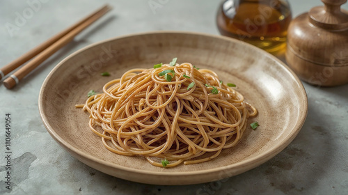 Minimalist Spaghetti Dish on Wooden Plate with Natural Light