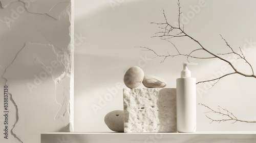 Minimalist Style Photo: Sleek White Bottle on White Ledge with Concrete Block Fragments, Stones, Beige Rock, and Branch on Light Gray Background in Ultra High Definition