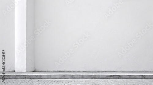 Minimalist urban setting with white wall, concrete pillar, and gray sidewalk forming clean architectural backdrop