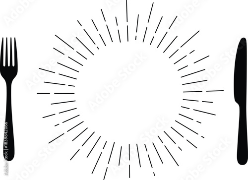 Minimalist Vector Design of Black Cutlery (Fork and Knife) with Central Sunburst Starburst Ray Circle Placeholder, Perfect for Restaurant Menu Covers and Food Service Branding
