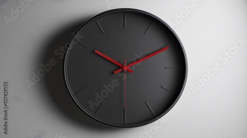 Minimalist wall clock, white wall background, no numbers, clean design, black frame, red second hand, monochromatic color scheme, modern interior, simplistic aesthetic.