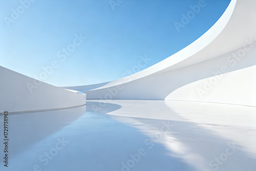 Minimalist white architectural curves with reflective water under a clear blue sky