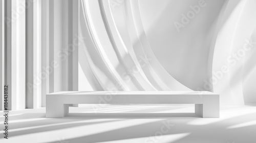 Minimalist white bench in modern abstract interior with curved walls and shadows, empty table