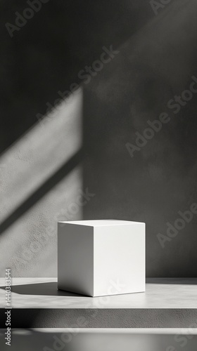 Minimalist white geometric cube casting sharp shadows on textured surface, exploring light, form, and spatial relationships in monochromatic composition