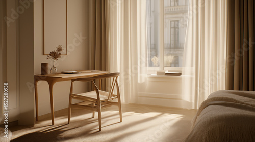 Minimalist workspace with chair and desk, neutral tones and natural light. Simplicity and focus in a clean, uncluttered environment.