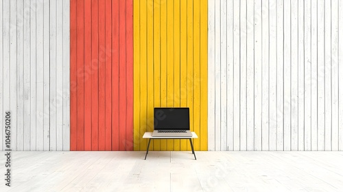 Minimalist workspace with colorful wooden wall accents