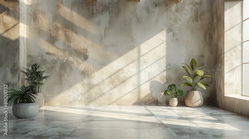 Minimalistic empty room interior with windows, colorful, sunlight and shadows. 3D Rendering. Generative AI
