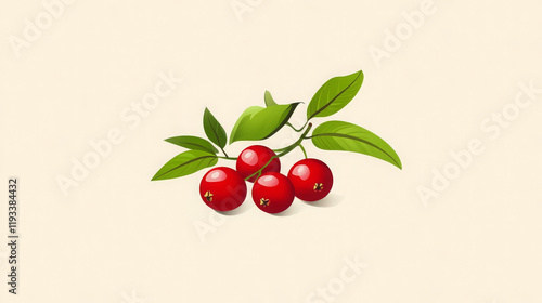 Minimalistic illustration of cluster of red lingonberries with green leaves, showcasing their vibrant color and natural beauty. Perfect for food related designs