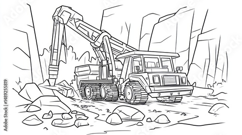 Mining truck drilling rocks, quarry landscape, construction site illustration