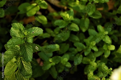 mint leaves in the garden with a blurred background.
