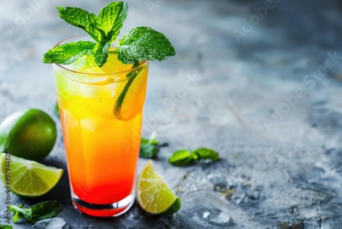 Mint Tequila Sunrise with extra mint leaves and lime, served in a tall glass, cool and refreshing background, copy space