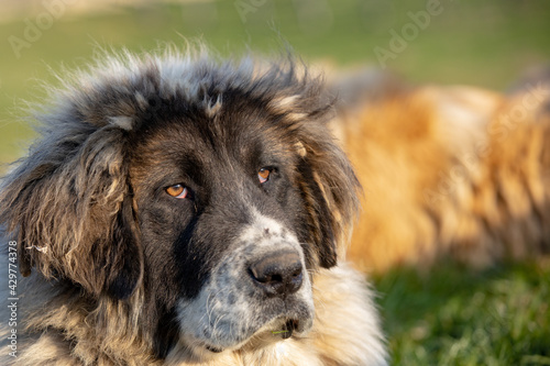 Mioritic shepherd sits in the grass