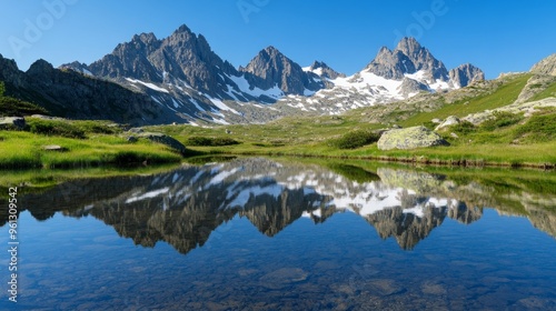 Mirror Lake Reflection, serene body of water reflecting majestic mountain peaks, surrounded by lush greenery, creating a tranquil and picturesque landscape scene.