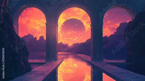 Mirrored galaxy archway twilight window reflection space landscape. Mirrored. Illustration