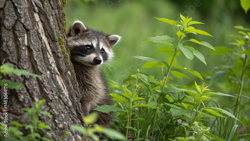 Mischievous baby raccoon peeking out from behind tree, surrounded by lush green foliage and plants, evokes sense of curiosity and playfulness in nature