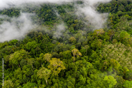 Mist and cloud forming over a dense, tropical rainforest in Thailand