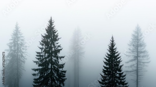 Mist forest concept. Misty forest landscape with tall evergreen trees shrouded in fog for a serene atmosphere.