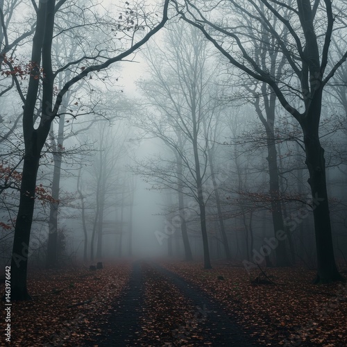 Misty Autumn Forest with Fallen Leaves and Bare Trees in Fog