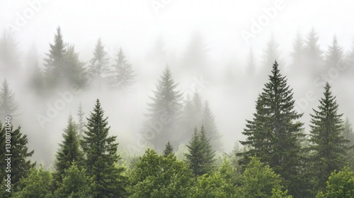misty evergreen forest, showcasing the quiet beauty of tall trees enveloped in a soft, calming fog